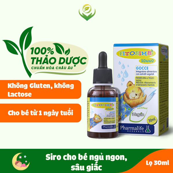TPBVSK Fitobimbi Sonno được sản xuất bởi Công ty Dược phẩm Pharmalife của Ý với các thành phần thảo dược chuẩn hóa châu Âu. Hoa Đoạn Lá Bạc trong Fitobimbi Sonno chứa các chất như flavonoid, glycoside, tiliroside và quercetin hỗ trợ an dịu hệ tiêu hóa, hạn chế rối loạn tiêu hóa. Sản phẩm còn bổ sung tía tô đất có chứa axit rosmarinic, axit oleanolic,… hỗ trợ giảm căng thẳng, rối loạn lo âu, rối loạn giấc ngủ, cải thiện chất lượng giấc ngủ cho bé mà không ảnh hưởng đến thần kinh.